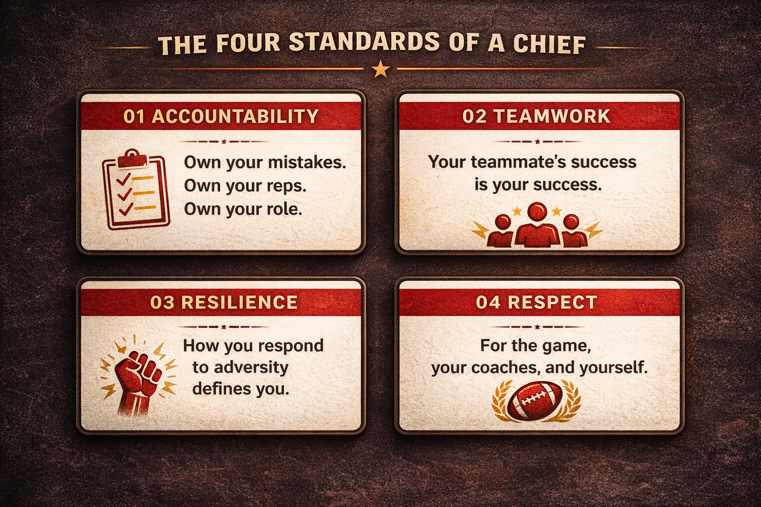 That standard follows you off the field, into the school hallways, and into your home. A Chief doesn’t take shortcuts. A Chief doesn’t blame others. A Chief lifts the room.